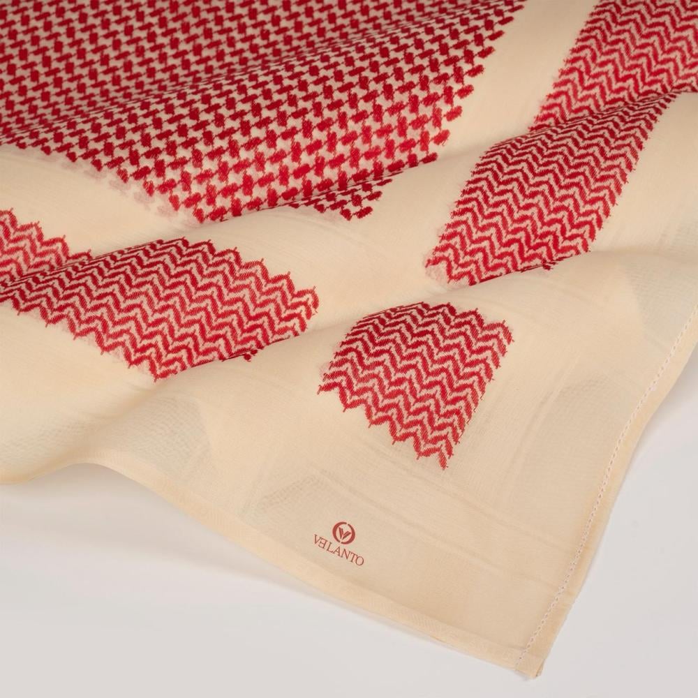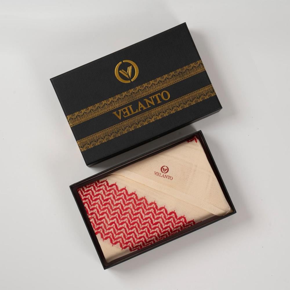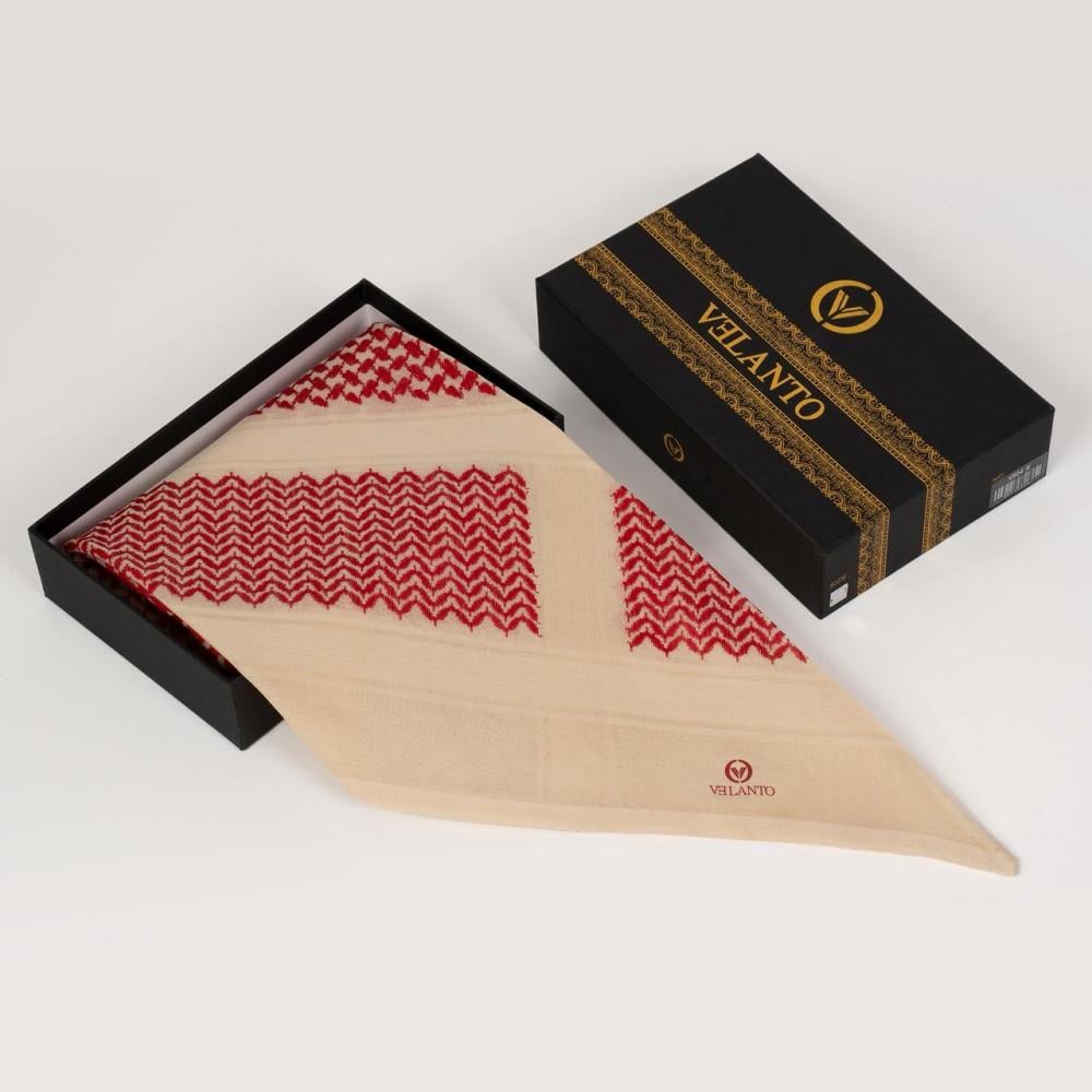 اللون البيج الفريد مع تداخل النقشة الحمراء يمنحك إطلالة شتوية راقية ومميزة عن الأشمغة التقليدية.
